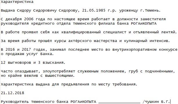 В большинстве случаев характеристику работнику выдают на фирменном бланке предприятия, если такого нет, то обязательно указание полных реквизитов фирмы или предпринимателя в первом разделе. Подписывают такую бумагу или непосредственно руководитель или же уполномоченной лицо с проставлением мокрой печати.